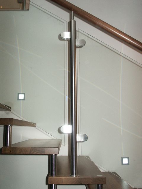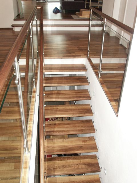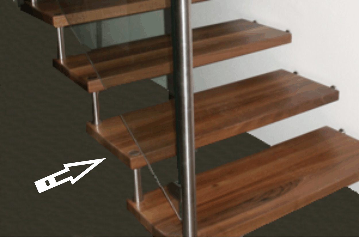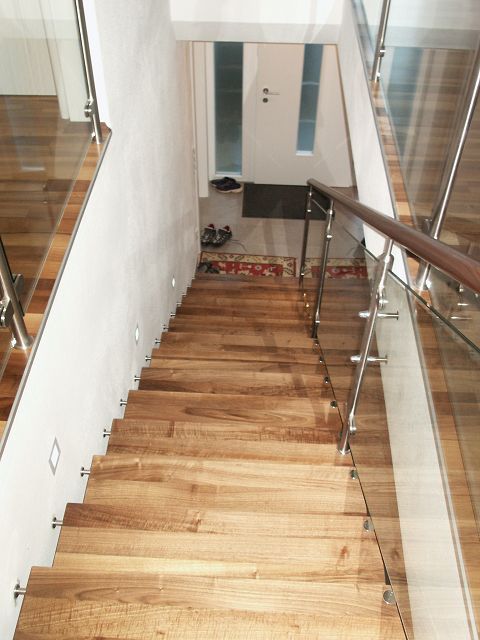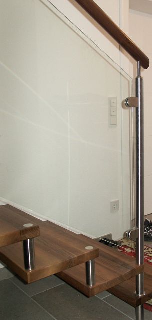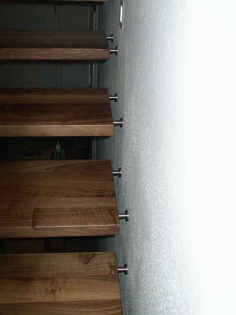 Diese Stiegenart bietet gute Kombinationsmöglichkeiten mit Stahl und Glas. Stufen- und Wandverbindung erfolgt im konkreten Fall mittels Distanzbolzen.